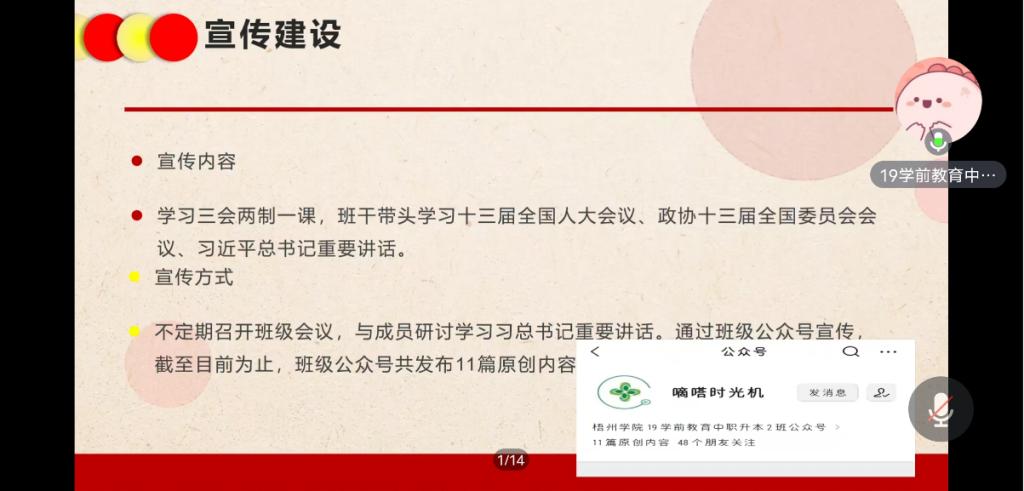此次宣讲,共青团梧州学院教师教育学院委员会第三届委员伞敬雯同学和19级学前教育中职升本2班团支书陈慧玲同学向教师教育学院全体团干部分别开展宣讲。她们分别结合自身学习和工作经验,号召广大青年要认真学习习近平新时代中国特色社会主义思想,认真学习贯彻党的二十大精神,立志做有理想、敢担当、能吃苦、肯奋斗的新时代好青年。