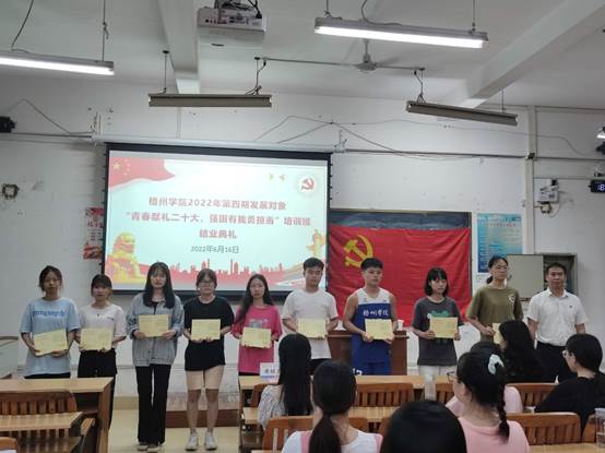 2022年6月16日下午,梧州学院2022年第四期发展对象“青春献礼二十大,强国有我勇担当”培训班结业典礼于明理楼S302教室举行。培训班承办单位教师教育学院党委书记黄焕克、党委组织委员陈燕出席了结业典礼。