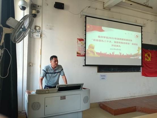 2022年6月9日下午,由教师教育学院党委承办的梧州学院2022年第四期发展对象“青春献礼二十大,强国有我勇担当”培训班开班典礼在明理楼S601教室举行。梧州学院党委常委、党委组织部部长、统战部部长黄健武、教师教育学院党委书记黄焕克、教师教育学院党委副书记、纪委书记何志伟出席开班典礼。