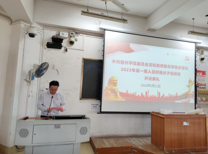 2022年5月11日下午17:30,中共梧州学院委员会党校教师教育学院分党校2022年第一期 “喜迎二十大,永远跟党走,奋进新征程” 入党积极分子培训班开班典礼在明理楼S503举行。教师教育学院党委书记黄焕克、党委副书记、纪委书记何志伟出席开班典礼。