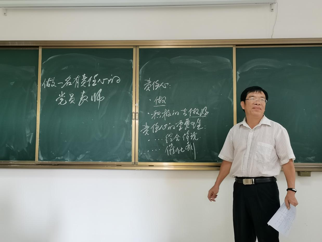 陈启义同志主要讲了如何做一名有责任心的党员教师,对于有责任心,陈启义同志向我们讲述了责任心的重要性,责任心是党员教师的综合体现,责任心是党员教师的催化剂。作为教师队伍中的模范带头人,其言行不仅潜移默化地教育影响着学生,还在很大程度上教育影响着周围的广大教师。因此,党员教师要不断锻炼先进思想,用先进的思想和科学的理论武装头脑。要从思想上保持对教育事业的执着和热爱,用师爱建立与学生间崇高、无私、美丽的情感,用自己的人格力量和情感力量去教育和影响广大教师,成为爱岗敬业、无私奉献的一面旗帜。