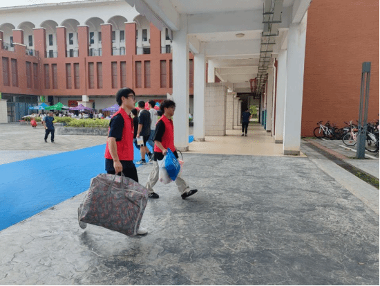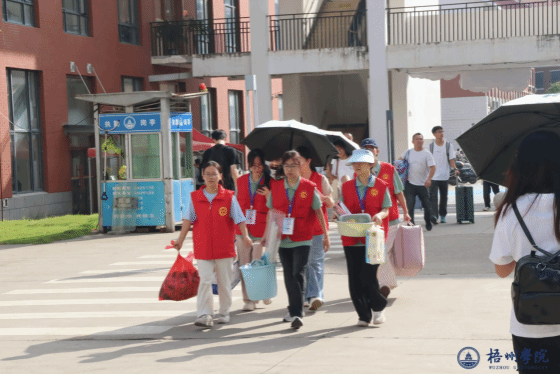 志愿者们忙着接过行李、指引路线,还为等候的家长备好茶水,细致的服务让陌生感渐渐消散;“我与梧院第一张合影” 打卡点前,新生们笑着定格入学首刻,快门声里满是对未来的期待。学院党委书记姚江波、院长赵伟也穿梭在现场与宿舍间,时而慰问忙碌的工作人员,时而与新生和家长轻声交流,耐心倾听需求、送上鼓励。