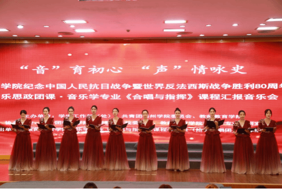 2025年9月21日晚,教师教育学院在明理楼学术报告厅举办音乐学专业《合唱与指挥》课程汇报音乐会。本次音乐会以 “音育初心 声情咏史” 为主题,以纪念中国人民抗日战争暨世界反法西斯战争胜利80周年为契机,将专业课程教学实践与思政教育深度融合,通过艺术表演传递家国情怀,为现场近600名师生带来情感与思想的双重洗礼。学生工作部(处)、校团委、教师教育学院相关负责人参加活动。