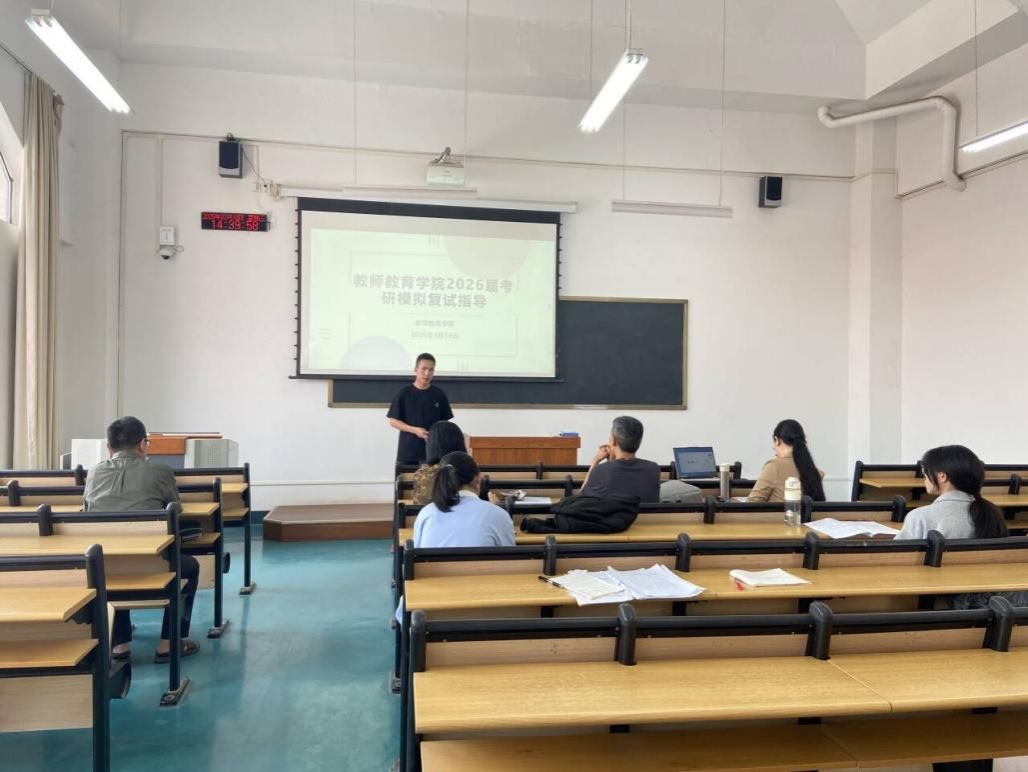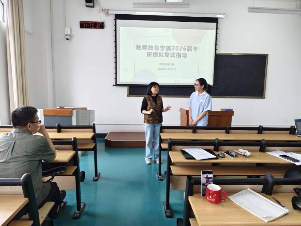 2026年3月18日下午14:00教师教育学院在北区教学楼N408成功举办考研复试模拟面试辅导。赵伟院长及杨再峰、方朝华和汤广全三位博士担任面试指导老师,已通过考研初试的同学参加模拟面试辅导。