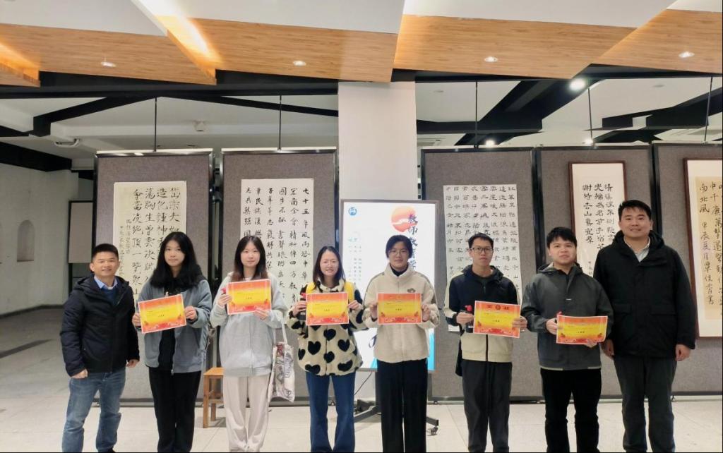 在颁奖环节中,庄雨副书记与陈柏全老师共同为获奖学生颁发了荣誉证书与奖品,并与他们亲切合影,留下了珍贵的瞬间。庄雨副书记激励在座的学生们,要坚守对书法艺术的热爱,以笔墨为媒介,传承文化经典,在艺术的道路上不断攀登,追求卓越。