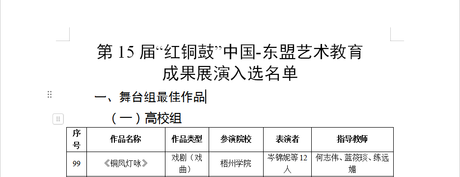 近日,自治文化和旅游厅、自治区教育厅联合公布了第15届“红铜鼓”中国—东盟艺术教育成果展演活动入选名单,我校原创曲艺作品《铜凤灯咏》获舞台组最佳作品,并于11月6日受邀赴桂林参加现场展演。