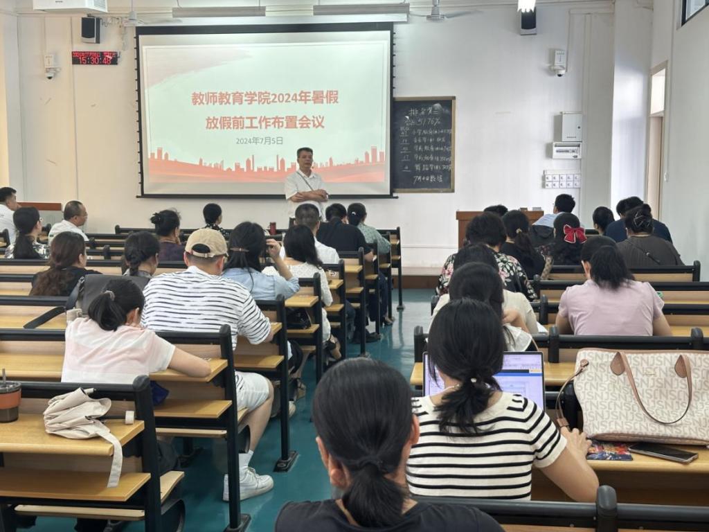 2024年7月5日下午,教师教育学院于北片区教学楼北楼406教室举行了2024年暑假前工作布置会议,学院全体教职工参加,院长助理谢展鸿主持会议。