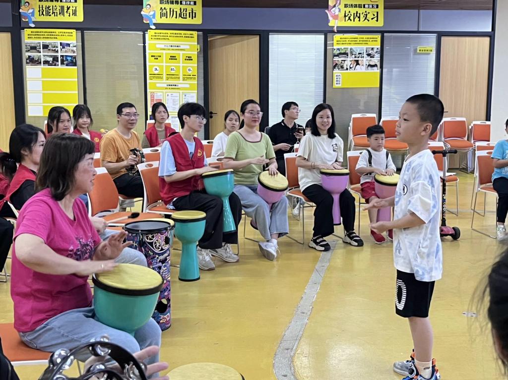 本次亲子鼓圈活动,在梧州学院关爱下一代工作委员会石夏莉老师引导下家长、孩子以及大学生围坐成一个两层大圈,每人手中都有一种乐器,在历时一个半小时的活动中,家长与孩子全程热情参与到鼓圈身势打击体验、节奏雕塑体验、游戏以及手语舞等环节中。
