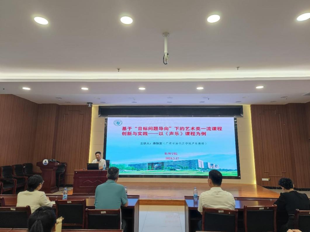 为提升教师教育学院课程教学水平,提高学院人才培养质量,扎实推进学校“教学质量年”建设。2024年5月17日上午,我院邀请了广东省一流本科课程、广东省普通本科课程思政示范课程、广东省首批本科学校美育名师工作室主持人蒋快安教授莅临我校开展《基于“目标问题导向”下的艺术类一流课程创新与实践——以<声乐>课程为例》及《一流课程及高校课程思政示范课程申报书解读、美育工作室建设经验分享》两场讲座。参加讲座梧州学院副校长范生汝、教师教育学院和宝石与设计学院主要领导以及我校师生代表和梧州市中小学教师师生代表。