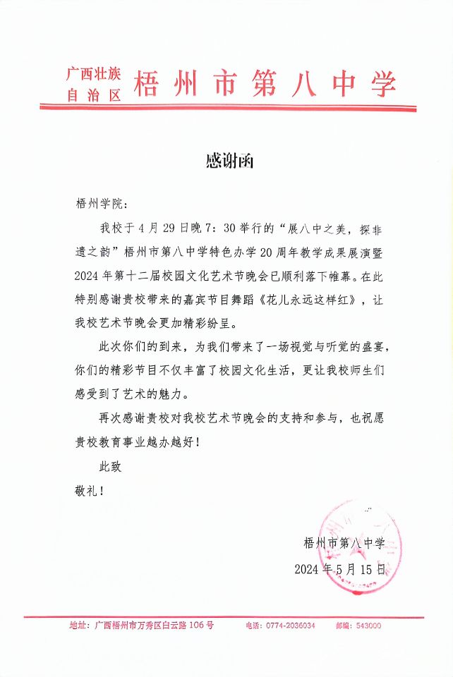 近日,教师教育学院收到梧州市第八中学发来的感谢信,感谢信对我校舞蹈作品《花儿永远这样红》参加梧州市第八中学"展八中之美,探非遗之韵"梧州市第八中学特色办学20周年教学成果展演暨2024年第十二届校园文化艺术节晚会表示了肯定。并赞扬该节目为晚会带来了一场视觉与听觉的盛宴,不仅丰富了校园文化生活,更让梧州市第八中学师生们感受到了艺术的魅力。