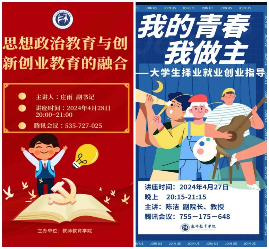 为提升教学质量、促进学生全面发展、增强毕业生就业创业能力,教师教育学院于4月28日至5月14日举办了大学生创新创业教育系列主题讲座。学院领导带头主讲,共进行了17场线上讲座,组织2024届毕业生及其他年级学生一千余人次参加。