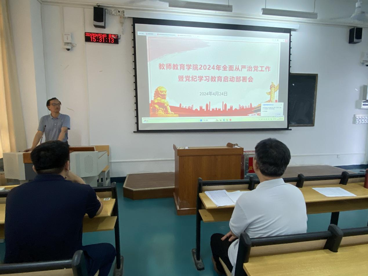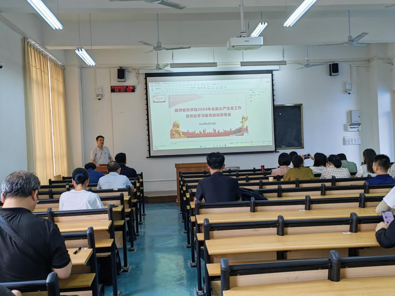 4月24日下午,教师教育学院召开2024年全面从严治党工作暨党纪学习教育启动部署会,学院全体教职工参加会议,会议同时特邀学校保卫处处长谢啟禄进行安全教育和专题培训。
