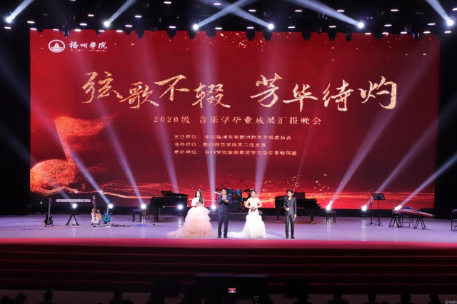 以琴瑟之音会八方来客,12月14日晚,教师教育学院在体育馆三楼举行2020级音乐学专业“弦歌不辍,芳华待灼”毕业成果汇报晚会。校长杨奔,党委副书记梁业华,副校长覃雄彪,梧州市文学艺术界联合会党组书记、主席林敏华,副主席潘彤出席活动,学校各单位、各部门、各二级学院领导、教师、学生,及社会各界人士观看此次演出。