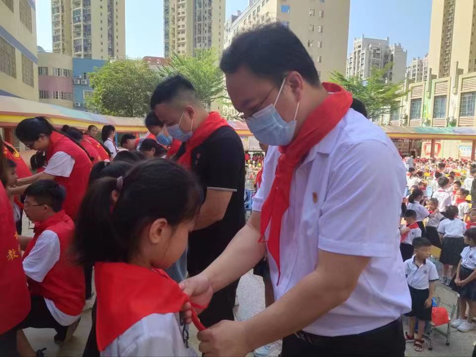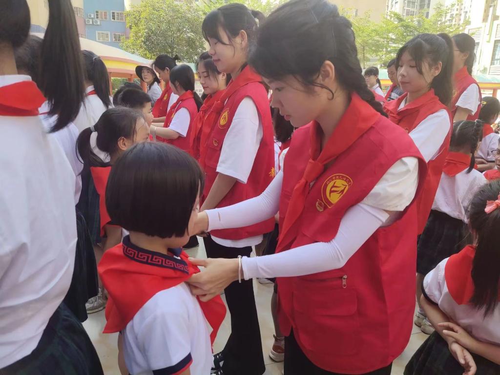 师生代表们为长红小学入队队员和新进少先队组织授予红领巾和队旗。教师教育学院团委负责人蔡林峰、长红小学副校长曾金凤作了讲话,并强调要时刻牢记习近平总书记提出的“立志向、有梦想、爱学习、爱劳动,爱祖国”的殷切希望,以实际行动践行“请党放心,强国有我”的青春誓言。