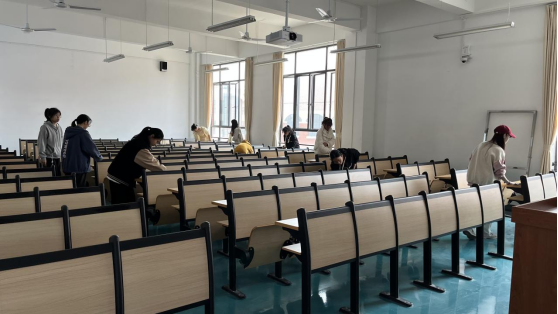 2023年2月19日梧州学院教师教育学院师生对我院教学楼教室开展开学前专项清洁活动。