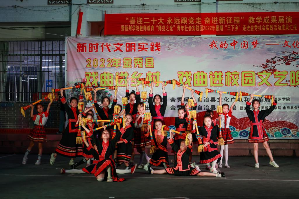 7月13日晚,“喜迎党的二十大 永远跟党走 奋进新征程”教学成果展演暨“师范之光”青年社会实践团2022年暑期“三下乡”走进金秀社会实践活动成果汇报在金秀县民族小学顺利举行。展演以手工作品展览和晚会歌舞展演为表现形式。其中,手工作品涵盖了红色党史、民族团结、青春励志等丰富题材,获得观展群众的一致肯定;晚会节目朗诵《我的祖国》、舞蹈《童心向党》、歌伴舞《灯火里的中国》、小组唱《不忘初心》、合唱《我和我的祖国》等精彩的文艺作品更收获了观众们的阵阵掌声。
