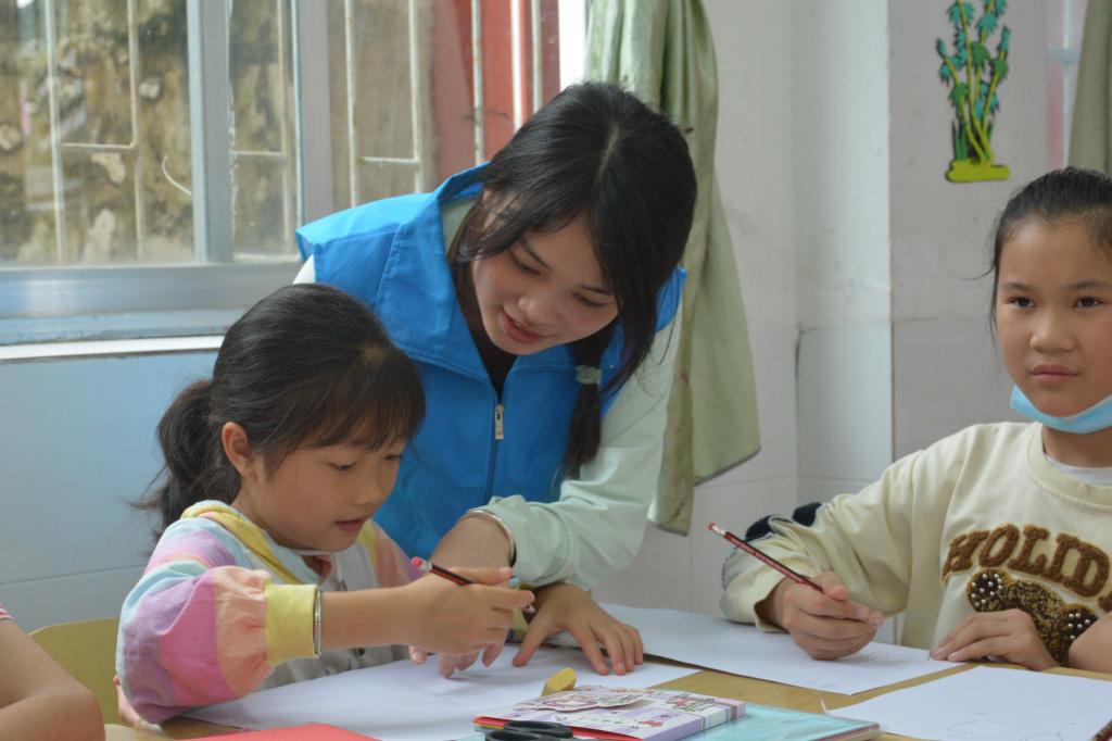 志愿者们指导孩子们画画