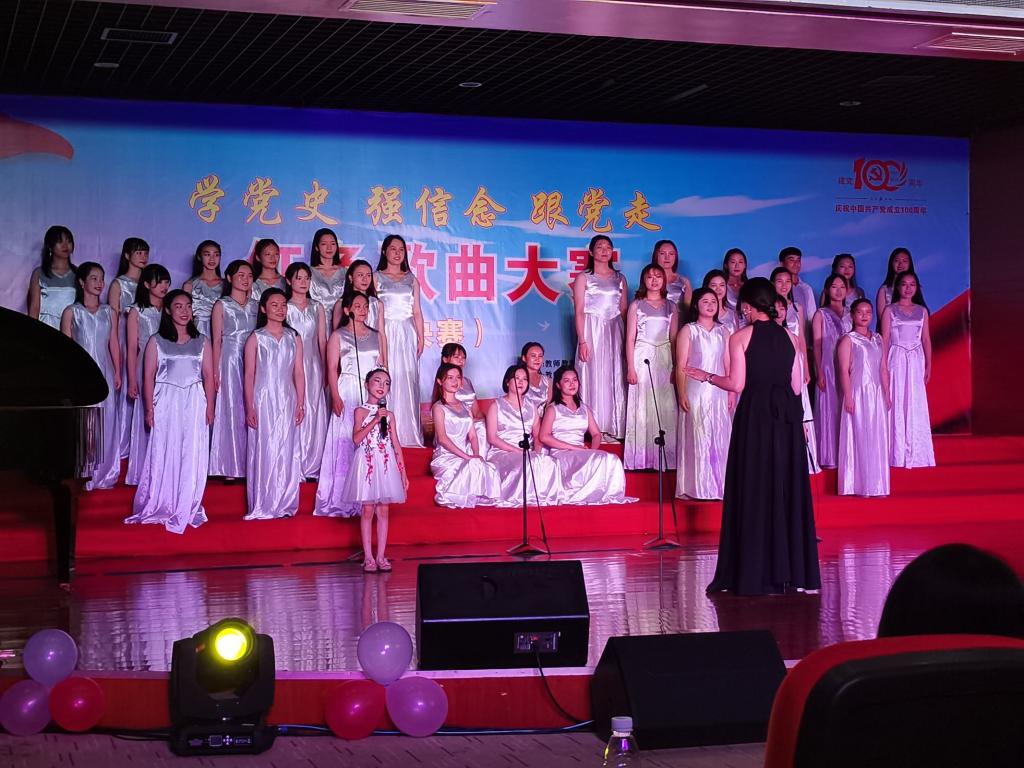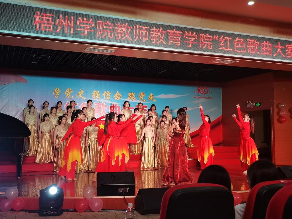 2021年6月6日晚19:30,教师教育学院在音乐厅举办主题为“学党史 强信念 跟党走”红色歌曲大赛决赛,出席决赛现场的领导老师有:梧州学院党委宣传部部长陈健萍、学生工作处处长李德华,梧州学院教师教育学院党委书记梁文忠、院长谢龙华、党委副书记罗吉娟及各班辅导员、班主任、学生代表。担任本次大赛评委有:教师教育学院邢方君老师、龙慕兰老师、杨思毅老师。