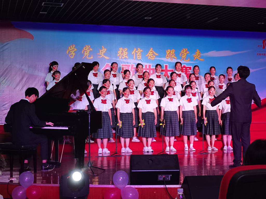 决赛中,17支比赛队伍用高昂的歌声给现场观众呈现了一场红歌盛宴,同学们用真挚的歌声真切表达了:"无论多么优美的歌曲,也唱不够我们对党的爱,不管多么绚丽的诗行,也说不尽我们对党的情。"