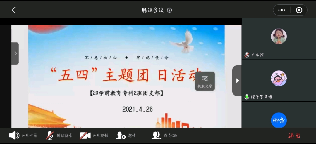 教师教育学院各基层团支部围绕党史学习教育、新团员入团仪式、重温入团誓词、学习习近平总书记在清华大学讲话、学习五四精神、学习青年大学习等开展“五四”主题团日活动,本次活动通过线上、线下两种形式开展,截至2021年5月7日,39个基层团支部已全部开展。本次“五四”主题团日活动进一步加强了团员思想建设、加强了团支部的凝聚力。