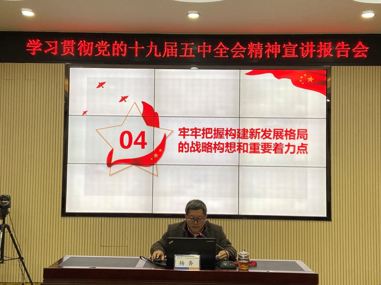 在宣讲中,杨奔校长从深刻认识决胜全面建成小康社会取得的决定性成就;准确把握我国发展环境面临的深刻复杂变化;准确把握2035年远景目标和““十四五””时期我国发展的指导方针、主要目标、重点任务;牢牢把握构建新发展格局的战略构想和重要着力点;深刻把握十九届五中全会公报的新表述和关键词五个方面对党的十九届五中全会进行了全面解读和深入阐述。他强调:十四五期间也是我校发展战略机遇期,学校““十四五”规划”编制既要立足校情,实事求是,还要鼓舞人心,且要量力而为。我们要抓住机遇,着力深化改革,破解发展难题。为实现学校第三次党代会提出的建设特色鲜明的应用型高水平大学建设目标而努力奋斗。
