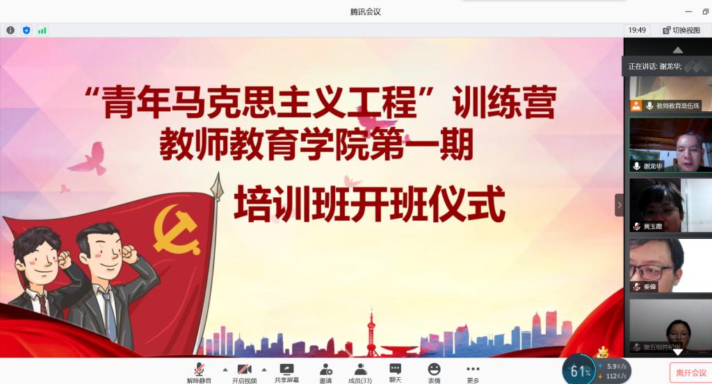 2020年7月8日20:00,教师教育学院在线上举行以“不负韶华,筑梦青马—争做风华少年”为主题的“青年马克思主义工程”训练营开班仪式。教师教育学院院长、党委副书记谢龙华,以及共青团梧州学院委员会副书记秦伟参加本次仪式,教师教育学院团委书记莫伍珠老师主持开班仪式。