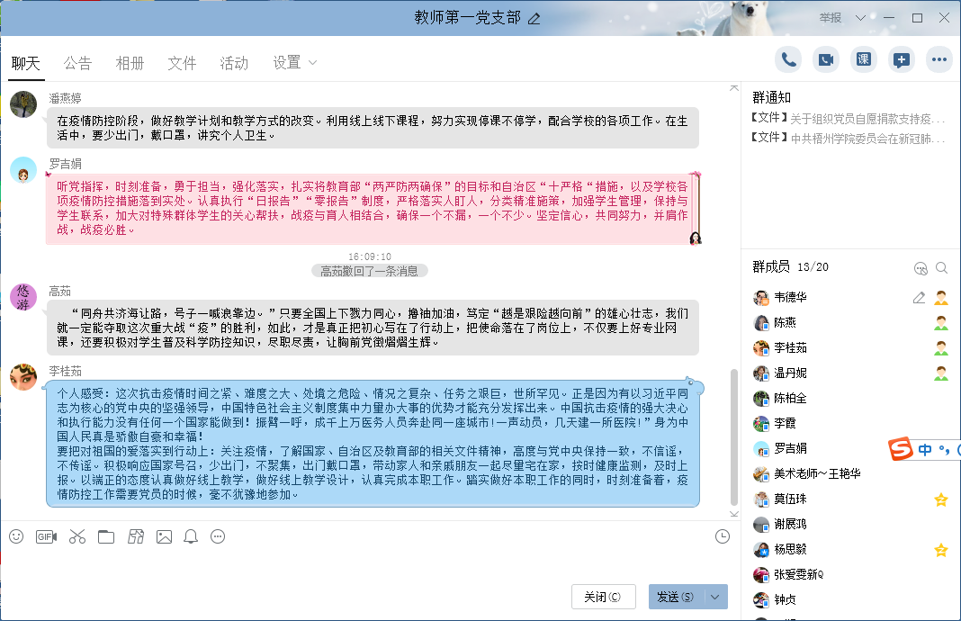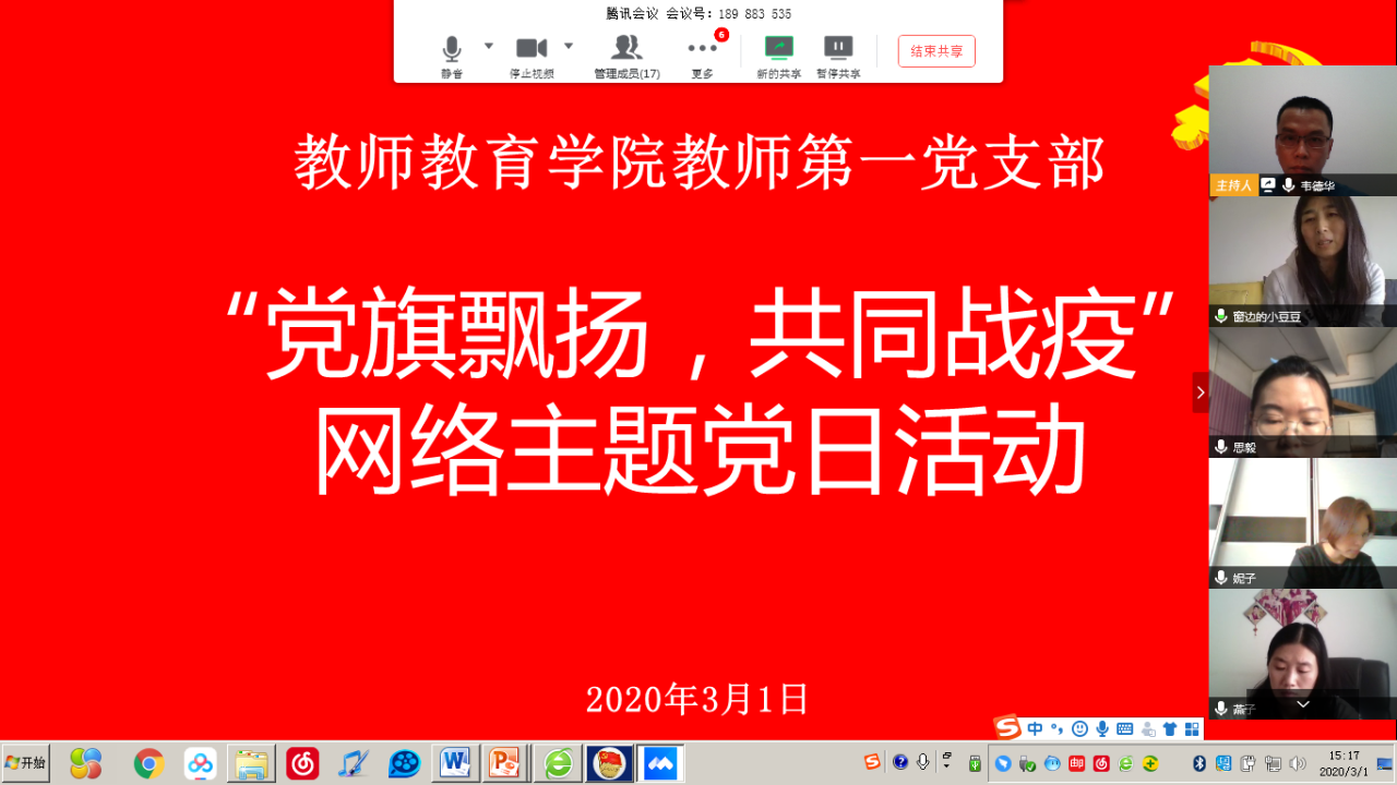 3月1日下午,按照学校党委组织部的要求,教师教育学院教师第一党支部在新冠肺炎疫情防控期间开展了“党旗飘扬,共同战疫”网络主题党日活动,党员们通过网络平台学习了疫情防控的有关知识,并就主题活动纷纷进行了讨论发言。