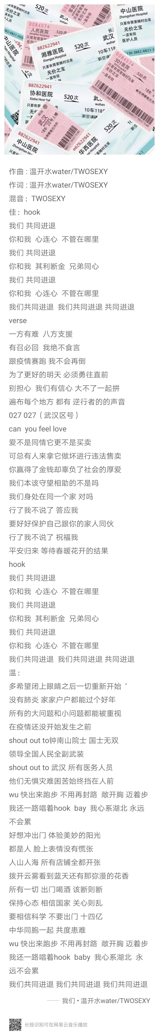 《我们》这首歌是梧州学院17音乐学1班吴业佳与玉林师范学院音乐专业温承开的两位同学,共同创作,运用说唱的方式分别从医护人员与普通百姓的角度出发来呼吁大家: 互相帮忙,共同战疫,相信科学,坚定信心,为武汉加油,为中国加油!同时致敬所有一线的英雄们,相信我们一定会战胜疫情!