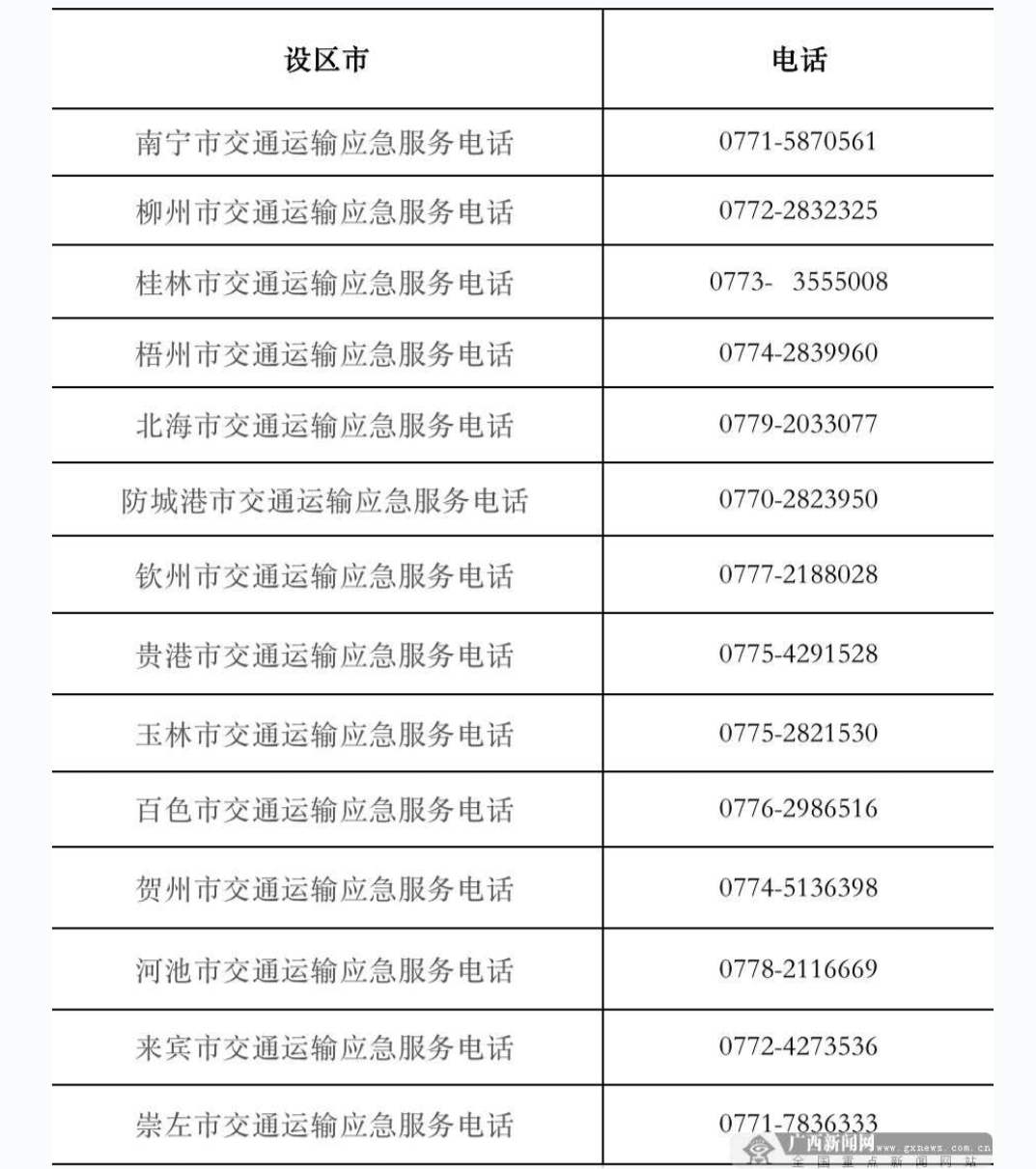 近日,为及时受理和解决高速公路、国省道干线、农村公路车辆通行中等相关问题,切实保障公路畅通,广西公布14个设区市交通运输协调服务电话,具体如下: