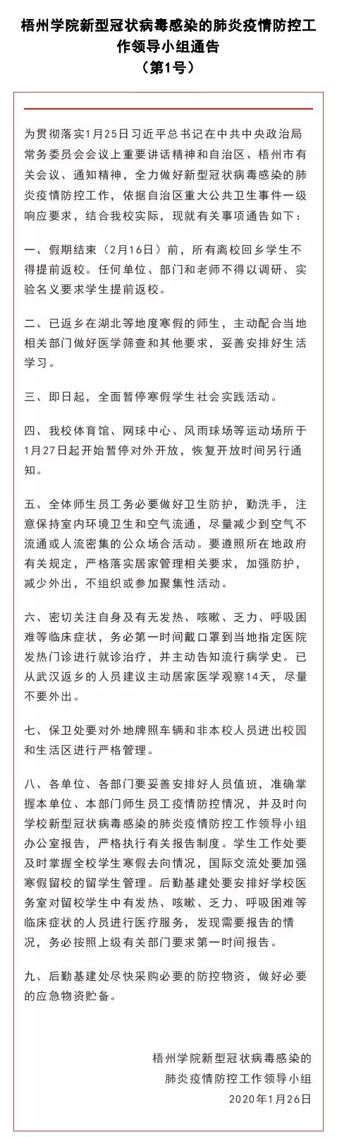 梧州学院新型冠状病毒感染的肺炎疫情防控工作领导小组通告(第1号)