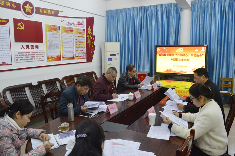 12月12日下午,教师教育学院中层党员领导干部“不忘初心、牢记使命”主题教育专题民主生活会在师范校区A栋党员活动室召开。学院中层党员领导干部紧扣学习贯彻习近平新时代中国特色社会主义思想这一主线,聚焦“不忘初心、牢记使命”这一主题,突出力戒形式主义、官僚主义这一重要内容,按照习近平总书记关于“四个对照”“四个找一找”的要求,盘点收获、检视问题、深刻剖析,严肃开展批评和自我批评。学校杨奔校长同志到会指导并作点评讲话。学院党委委员、纪委委员、党政办正副主任、教研室主任、实验室主任、党支部书记列席参加会议。会议由学院党委梁文忠书记主持。