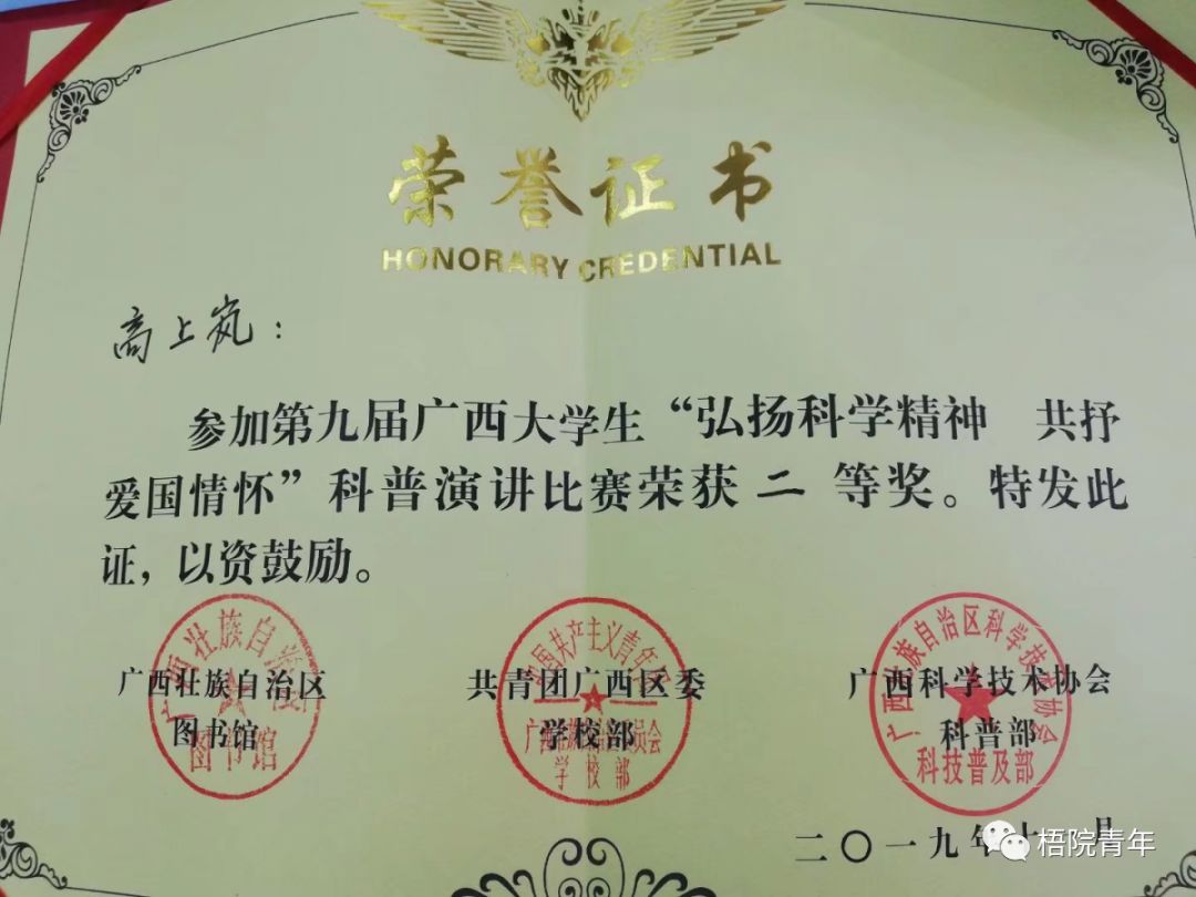 2019年6月荣获梧州市“学文明市民标兵•做新时代文明人”主题演讲决赛二等奖