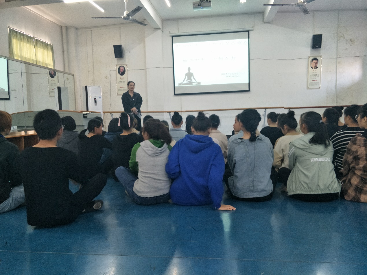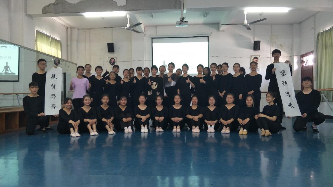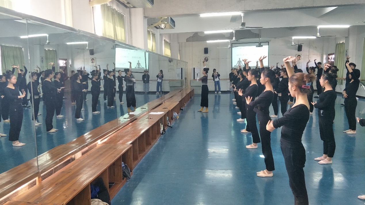 分享后,黄夏冰播放自己的一些演出视频、自己编舞的视频。接着把自己编的一个身韵组合《诗意》教给19级的同学,并耐心指导。
