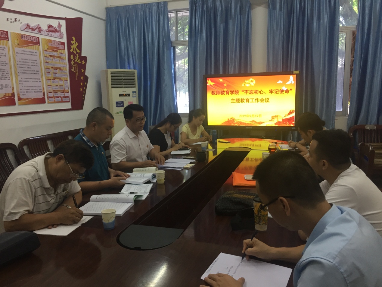 9月20日下午,教师教育学院党委在师范校区A栋党员活动室召开“不忘初心、牢记使命”主题教育工作会议。学院党委委员、各支部书记参加会议。