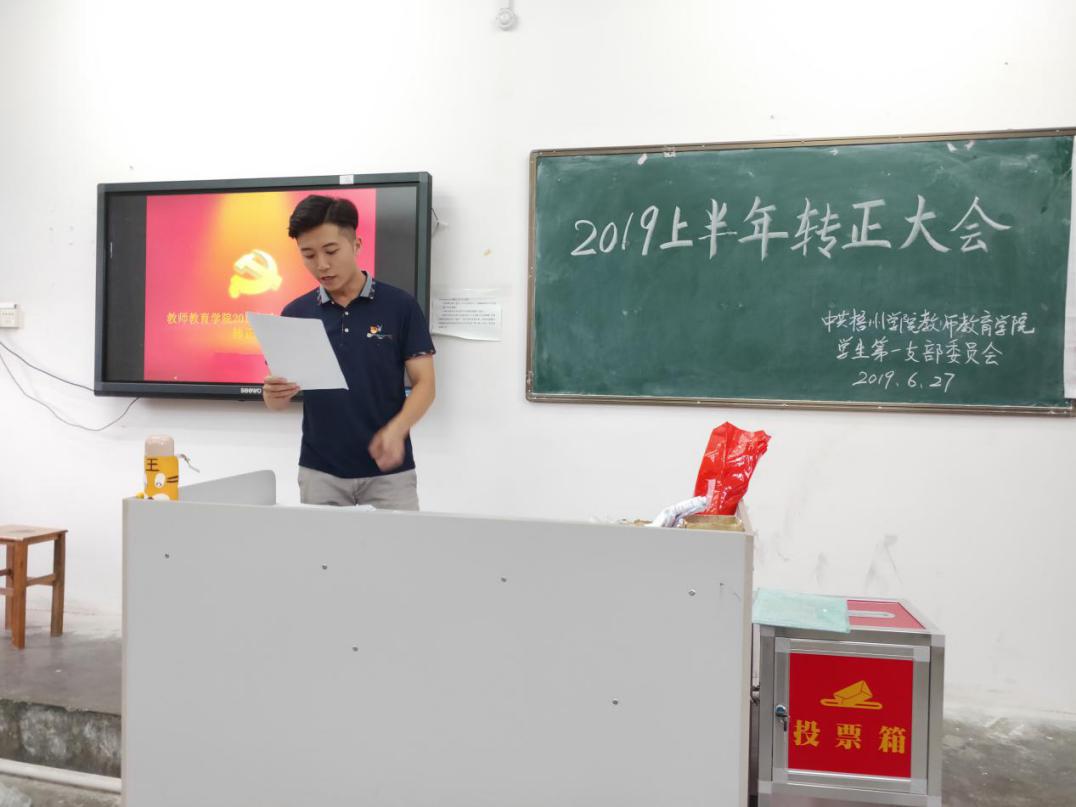 2019年6月27日晚,教师教育学院学生第一党支部在师范校区B栋201召开预备党员转正会议,会议由教师教育学院学生第一党支部书记陈驰宇主持,参加本次会议的有教师教育学院学生第一党支部全体党员。