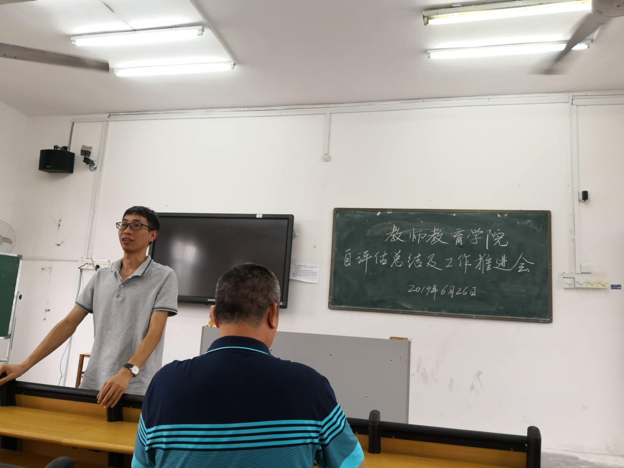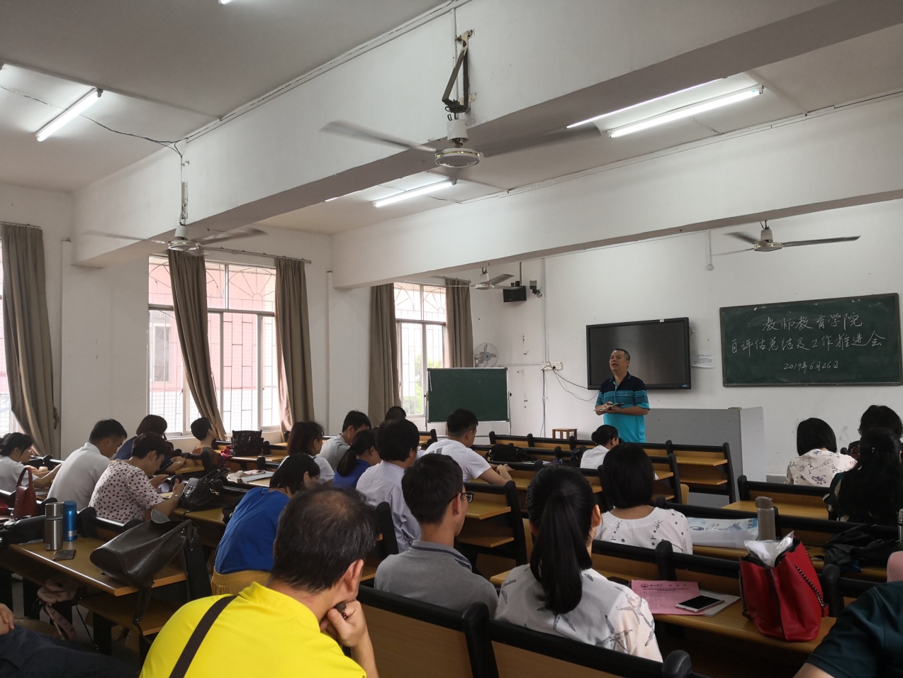 2019年6月26日下午,教师教育学院在B201教室召开了本科教学工作审核评估自评估总结及工作推进会。在会上,教师教育学院学前教育、小学教育、音乐学教研室三位教研室主任张阿丽、陈柏全、杨志华,实验室主任韦德华,党政办公室副主任王晨伟分别对评估专家在自主反馈会上意见并结合各教研室在自评估中发现的问题进行了总结,同时也对近期的整改措施提出了意见和建议。