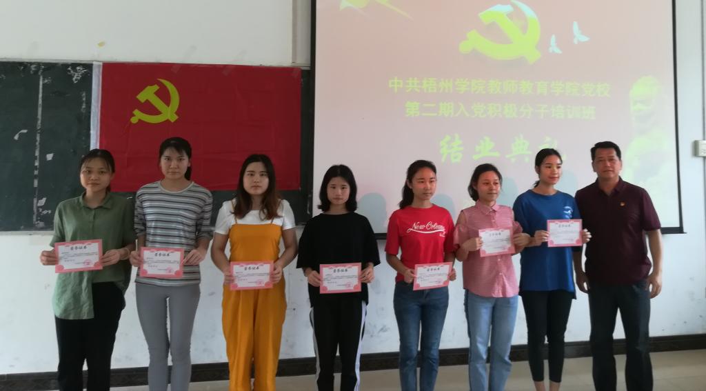 2019年5月29日下午,中共梧州学院教师教育学院委员会党校于师院C栋 504教室举办第二期入党积极分子培训班结业典礼。教师教育学院党委书记梁文忠老师、教师教育学院党委专职组织委员、教师教育学院学生第一党支部书记陈驰宇老师,教师教育学院学生第二党支部书记兼本次培训班班主任蔡林峰老师以及第二期入党积极分子培训班全体学员参加本次结业典礼。