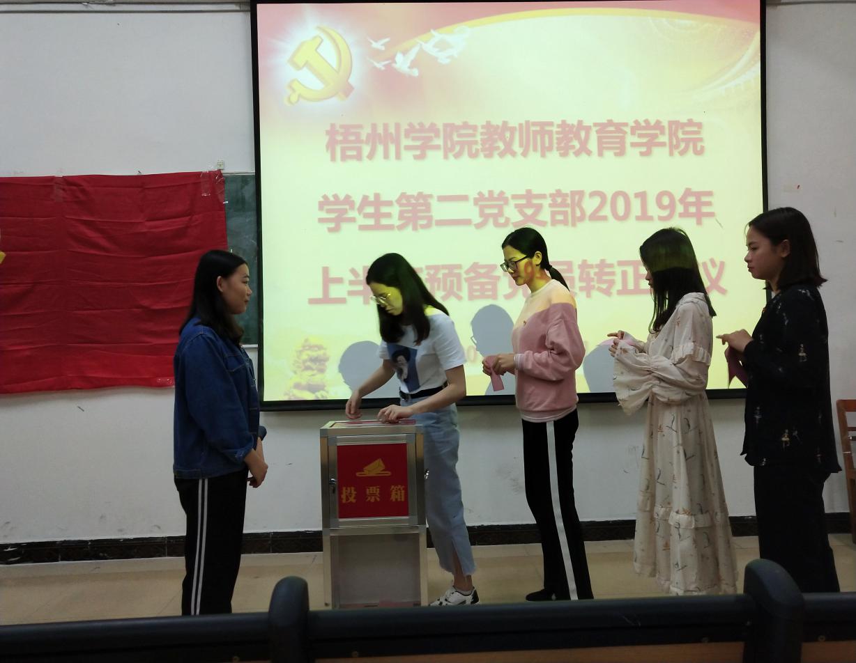 首先由学生第二党支部书记蔡林峰老师介绍许梦瑶的有关情况,其次由申请转正的预备党员许梦瑶同志宣读了自己的转正申请,详细汇报了自己在预备党员期间各方面的表现,对于自己的进步与不足进行了总结。最后由全体党员对许梦瑶同志作出了相应的评价,并以不记名的投票方式进行投票,许梦瑶同志获得了正式党员的全票推荐,转为中共正式党员。