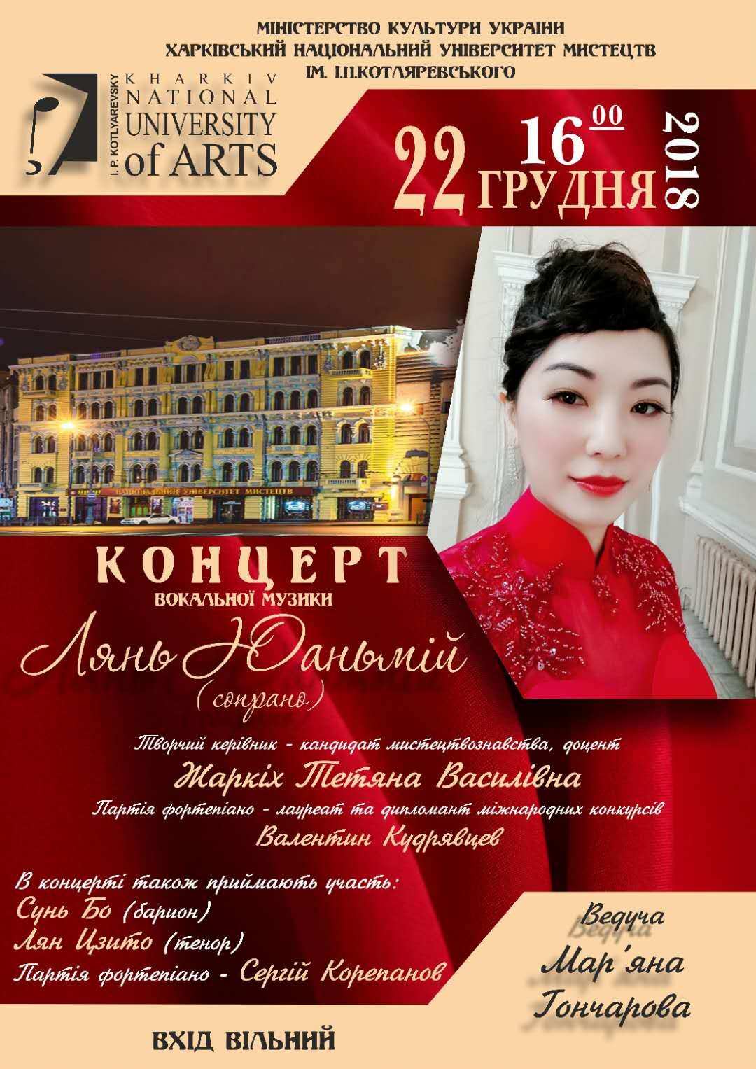 2018年12月22日,我校青年教师、抒情花腔女高音练远媚副教授,在乌克兰哈尔科夫国立艺术大学音乐大厅举办了她攻读音乐艺术博士学位的第二场独唱音乐会。