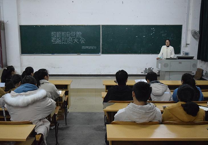 为推动学院学风建设,加强同学们的诚信教育,使同学们树立正确的荣辱观,养成诚实守信的良好作风,做到考试不违纪、不作弊,12月27日,教师教育学院在B101教室召开考前动员大会,学院党委副书记罗吉娟、学院团委负责人陈驰宇老师出席本次动员大会,学院各班级代表参加此次动员大会。