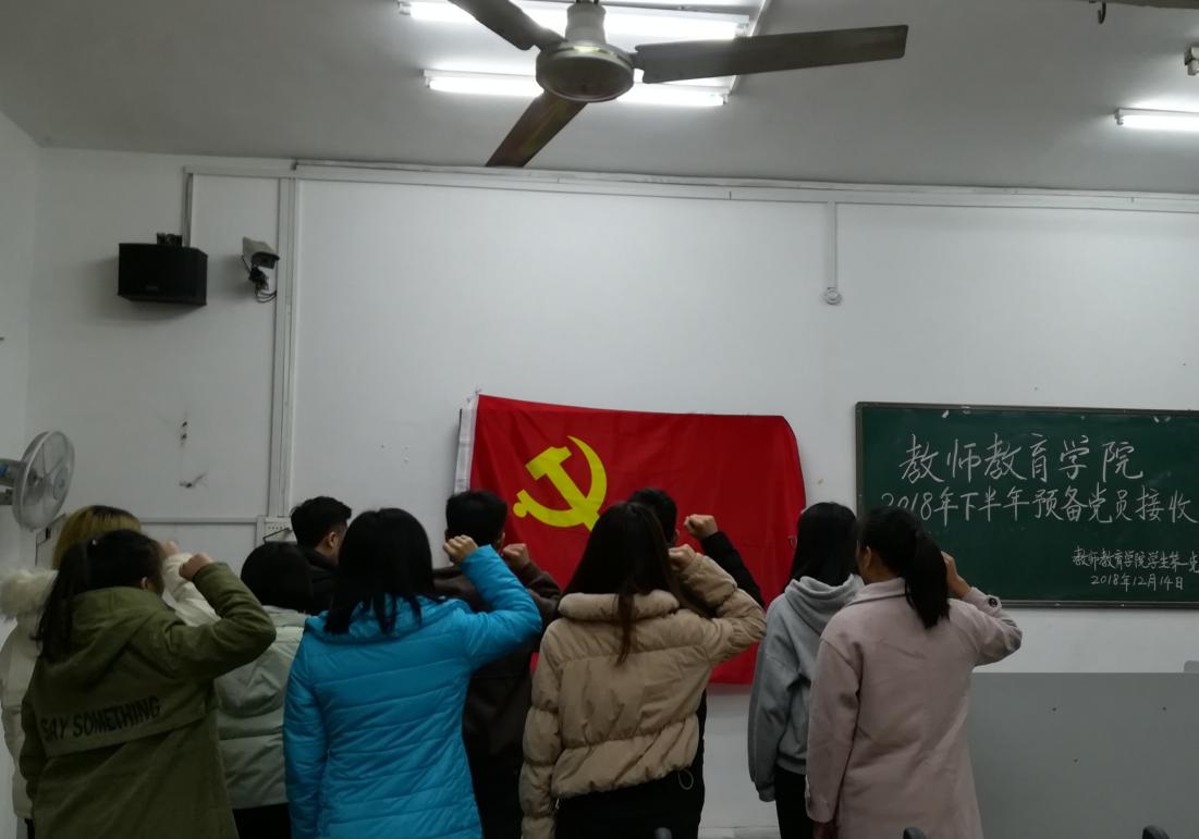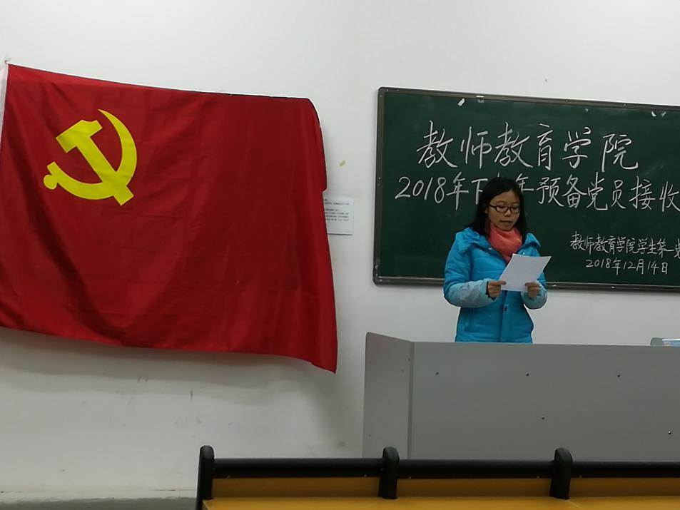 12月14日晚,教师教育学院学生第一党支部在我院B栋201举行了2018年下半年预备党员接收会议。参加本次会议的有教师教育学院学生第一党支部书记陈驰宇老师、中共党员王晨伟老师及全体支部党员和本次要接收的发展对象。