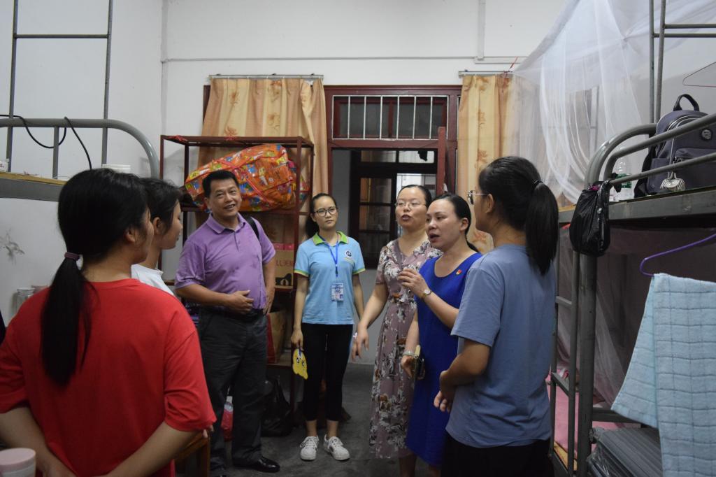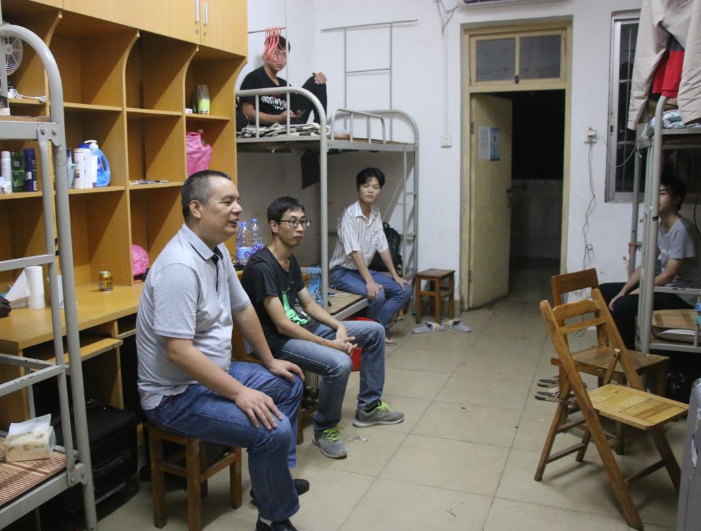 (梁文忠书记和老师们一起访谈新生宿舍)